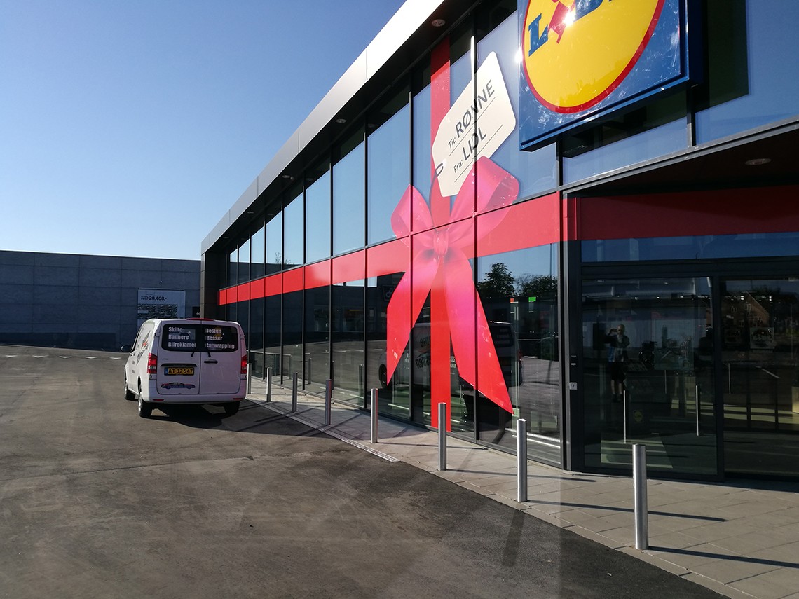 2 dage inden Lidl skulle åbne sin butik i Rønne, blev vi kontaktet med spørgsmålet om vi kunne “pakke” deres bygning ind i en sløjfe. Opgaven gik altså ud på, at montere “gavebånd” i form af rød folie, langs hele bygningen, samt at printe og montere en 4,2×5,5 meter stor sløjfe med til-og-fra kort. Det krævede at vi var 3 mand på, og at vi tog natten i brug, men 30 minutter inden åbningen klokken 8.00 var sløjfen monteret, og vi kunne nyde det færdige resultat.